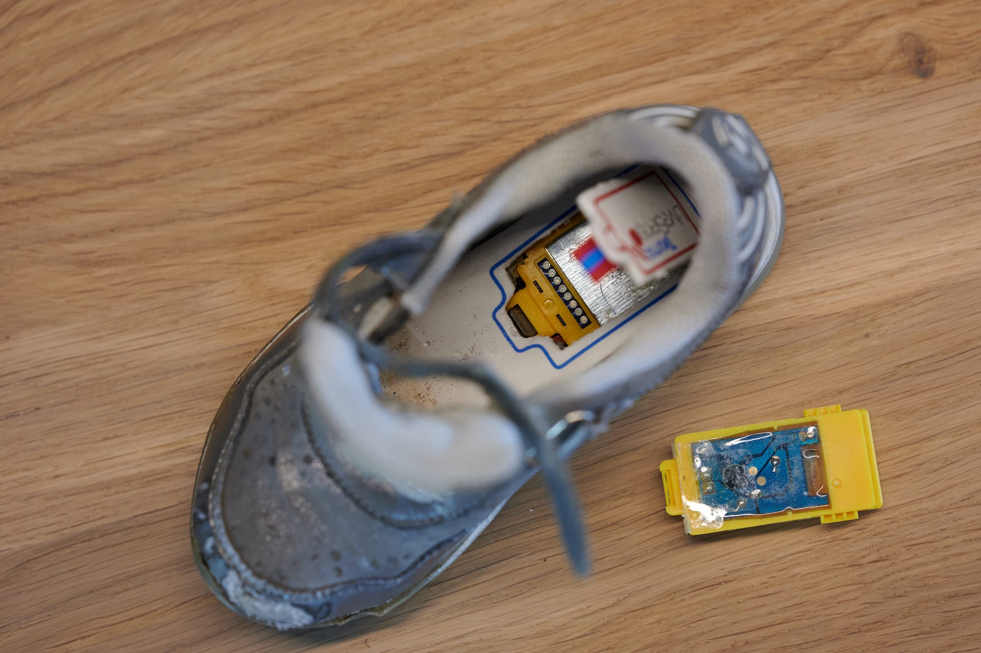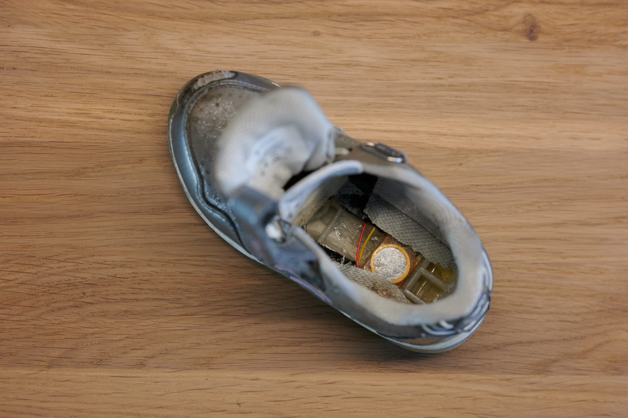 The right shoe, on the other hand, had a small flap beneath the insole. This flap allowed easy access to an exchangeable unit containing both the electronics and battery. While this made the battery unit replaceable, both designs shared one unfortunate trait: the battery and electronics were encased in resin, making them impossible to recycle easily.